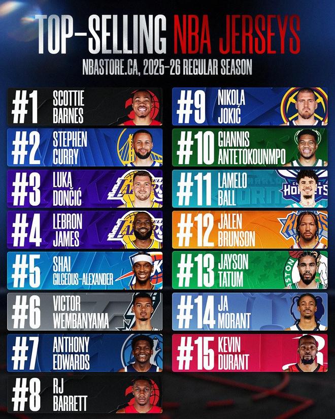 加拿大市場的這份榜單,正好展示了NBA當前的三大核心:本地認同、全球明星與新世代力量。